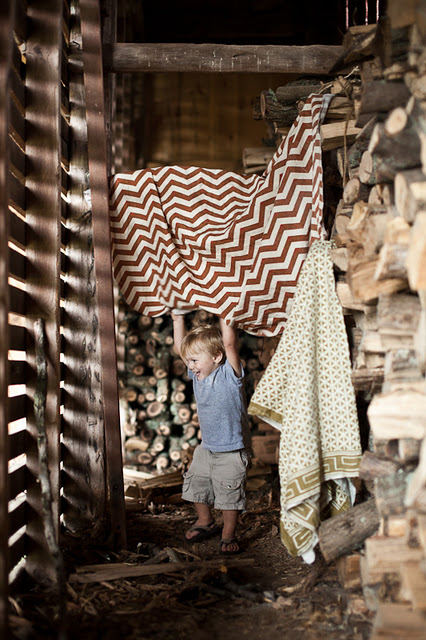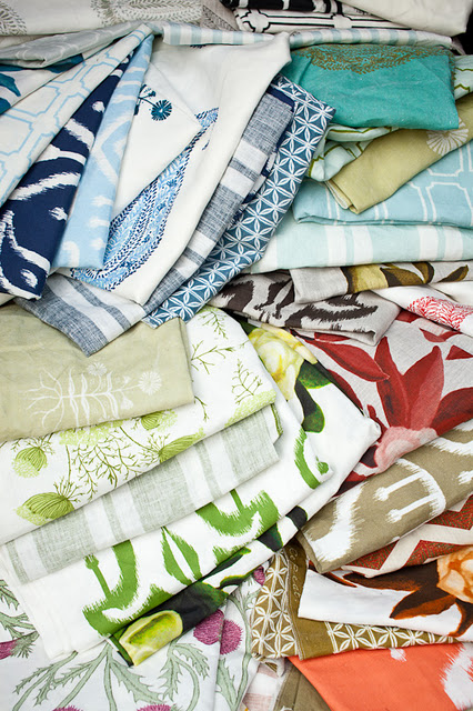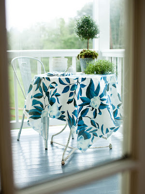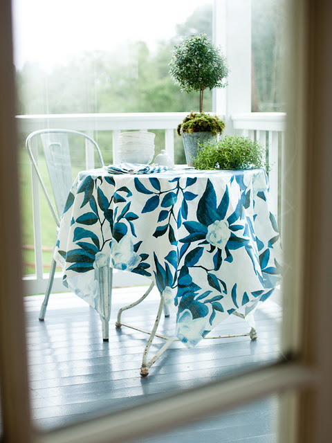I love everything about this gorgeous outdoor space, especially the tile wall and those indigo batik pillows. You can have your own made using this fabric.
