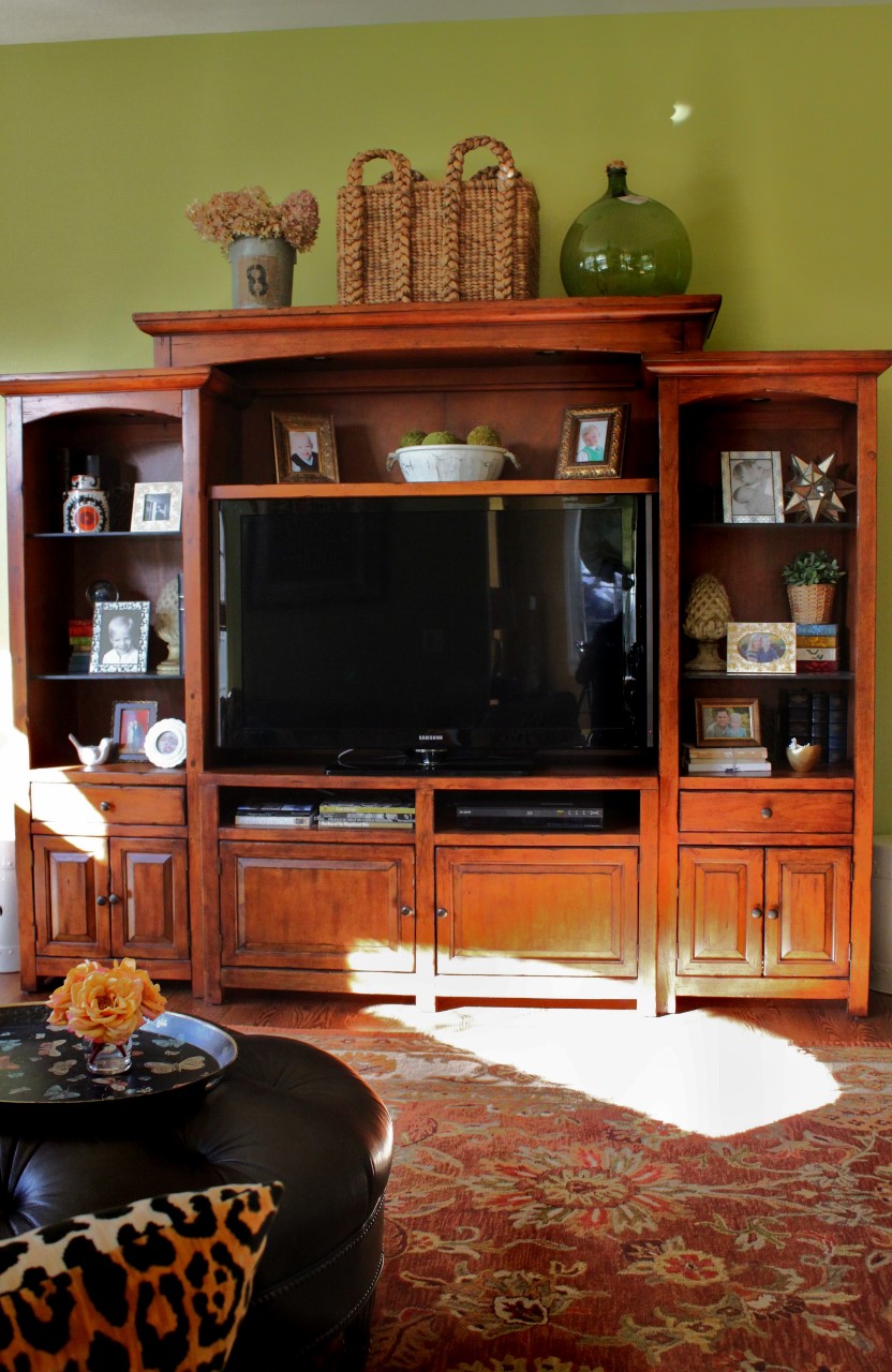 This gorgeous cabinet was not touched but we added a modern lamp, accessories, art, and mirror.