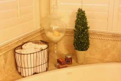 I like to decorate with things like glass jars of sea salts, fluffy white towels, elegantly wrapped soaps or other favorite products in beautiful packaging, while still keeping things fairly minimalistic.