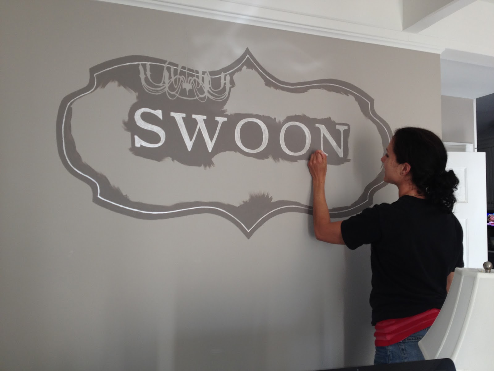 She is an amazing artist and has her own company, Global Murals. Here she is painting a large Swoon logo at Kristy’s house, above her workspace.